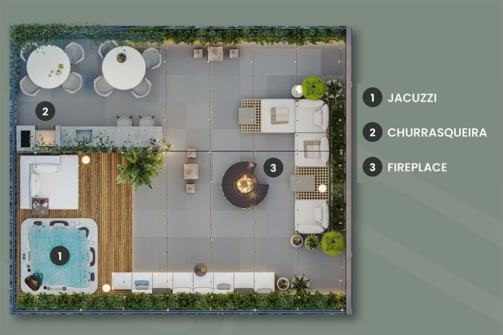 O Empreendimento: Brinquedoteca » Jacuzzi » Rooftop » Sãlão de Festas » Churrasqueira » Fireplace